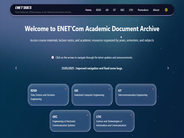 ENET'Com Docs is a centralized academic resource platform I built to help students at the École Nationale d'Électronique et des Télécommunications de Sfax access course materials effortlessly. The platform serves over 4 engineering programs (GEC, GT, GII, IDSD) and LTIC and provides a modern, student-friendly interface with integrated productivity tools.