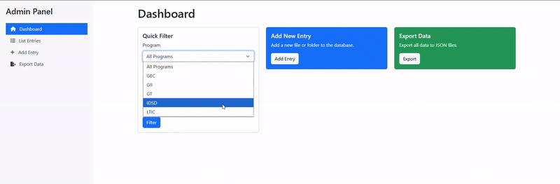 The static JSON files stored in static/data/ provide a cached, denormalized view of the database optimized for frontend consumption. Each file (e.g., GII_2nd_Year.json) contains a complete snapshot of documents for a specific program and year combination.