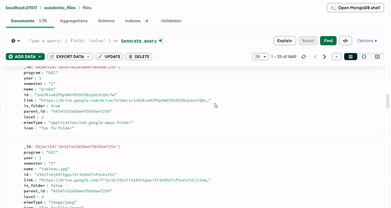 The MongoDB database (academic_files) uses a single collection (files) with a carefully designed schema that supports hierarchical organization. Each document represents either a folder or a file, with fields that capture both the Google Drive metadata and the academic context.
